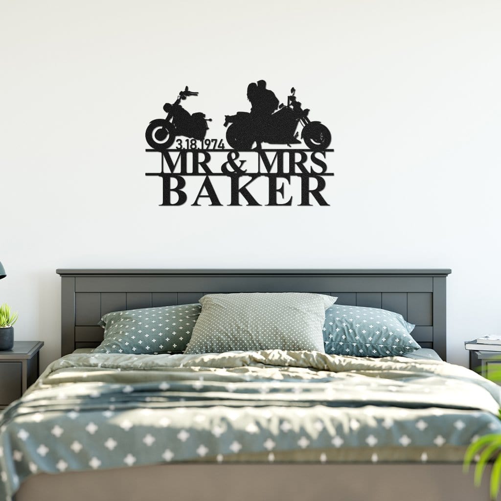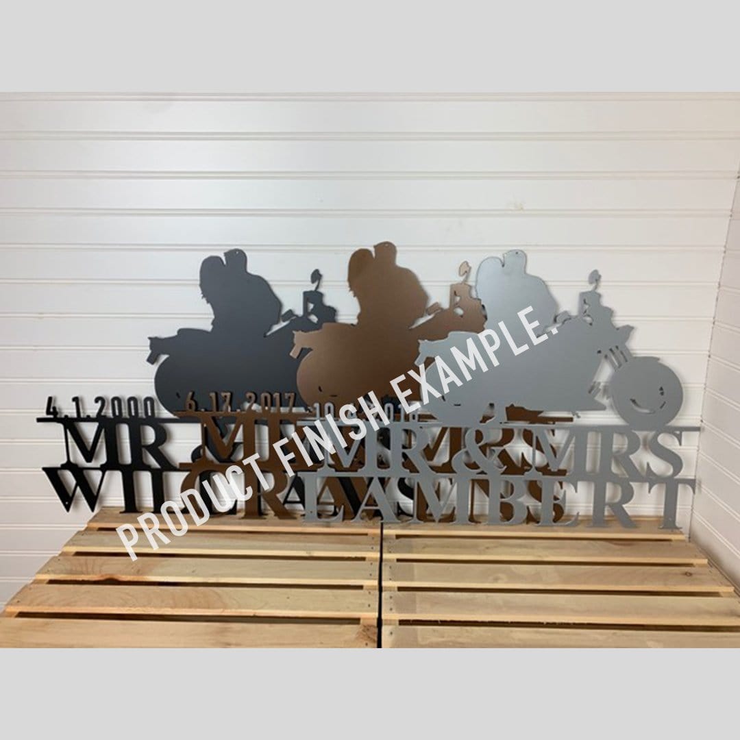 Sweet Ride's laser-cut Happily Married Biker Couple Personalized Wall Art brings together your most significantly meaningful bond into a design that truly speaks from the heart, bringing incredible meaning to any wall it adorns.