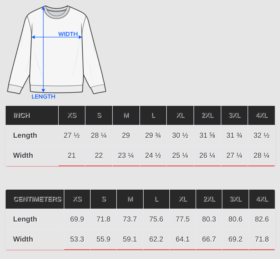 | Centimeters | XS | S | M | L | XL | 2XL | 3XL | 4XL |