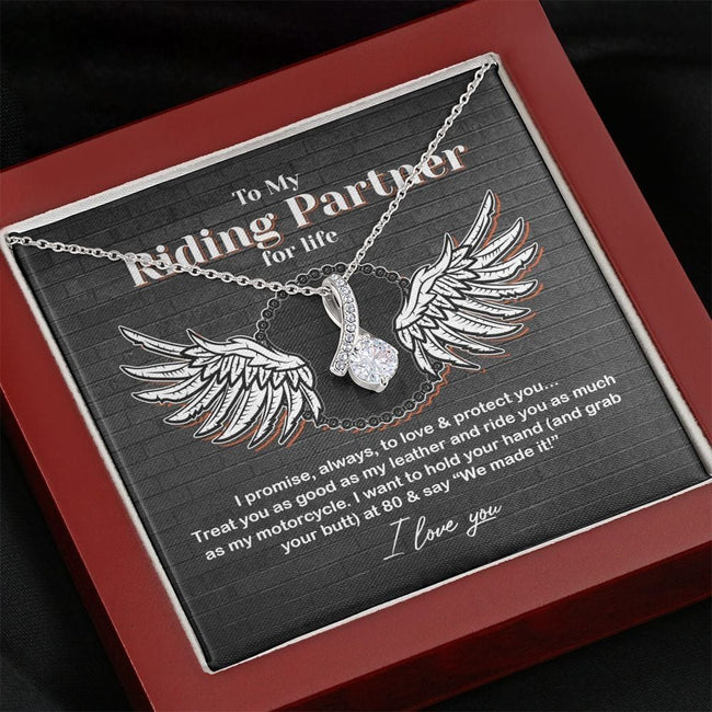 • Melt her heart with this ALLURING BEAUTY necklace gift! The petite ribbon shaped pendant is finished with 14K white gold over stainless steel, and is embellished with dainty clear crystals surrounded by a sparkling 7mm round cut Cubic Zirconia.